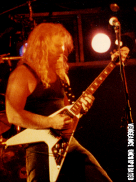 When Vengeance began writing songs for the next LP, Curt left the band, moving to Alabama for personal reasons. A year later he was back, re-recording the guitar tracks laid down by a fill-in guitarist. Soon the band, now joined by Mike as well as Curt, was touring again in support of the new record, Malicious Intent.