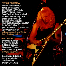 The best musician among the 4 of us, the guy who really gave the band credibility musically and gave style and technical chops to my lame-ass compositions, a guy Mike and I had known and admired as a guitarist and musician since highschool, shuffled off this mortal coil this year. We’ve dedicated this collection, nearly 20 years after the fact, to Curt, the best of us, who passed away this fall, 2014 as I write this.