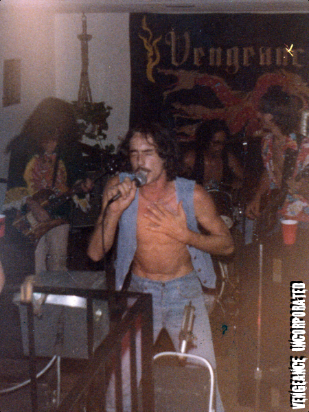 Vengeance was the name Guy (lead guitar, vocals), Mendel Schenck (bass) and Herb (drums, later bass) came up with for a band just before they were to play a keg party NYE ’81. In desperation, Herb and Guy started looking through Guy’s LP collection at song names for inspiration. Herb suggested an idea from the Thin Lizzy song “King’s Vengeance” from the LP Fighting.